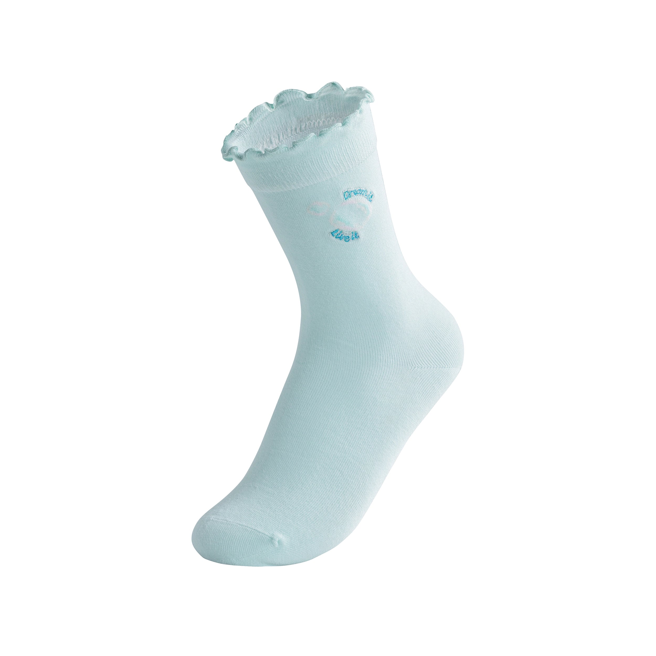 These sky mint crew socks with bubbly embroidery and ruffle trim keep things light and airy, a soft reminder that every dream begins with a wish.