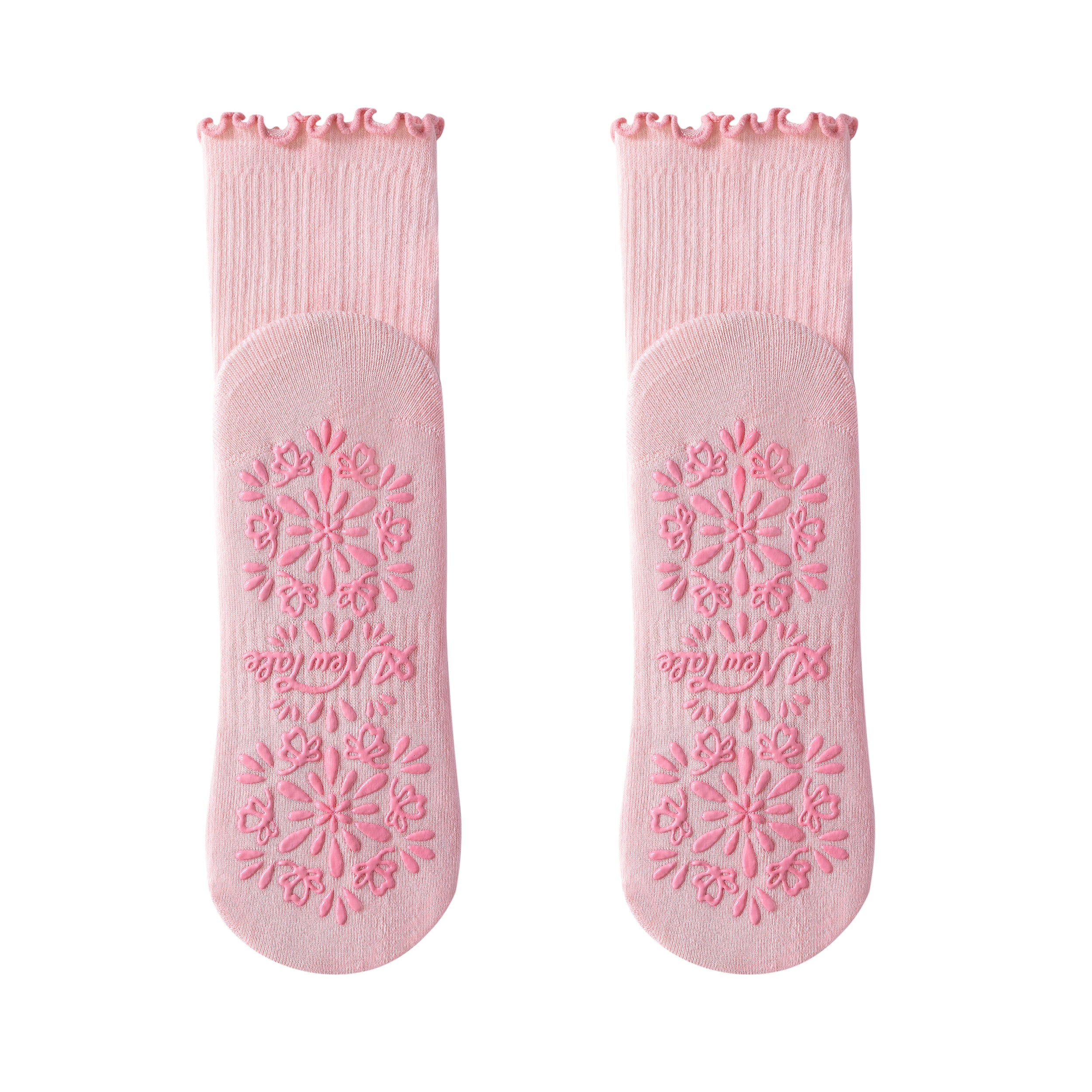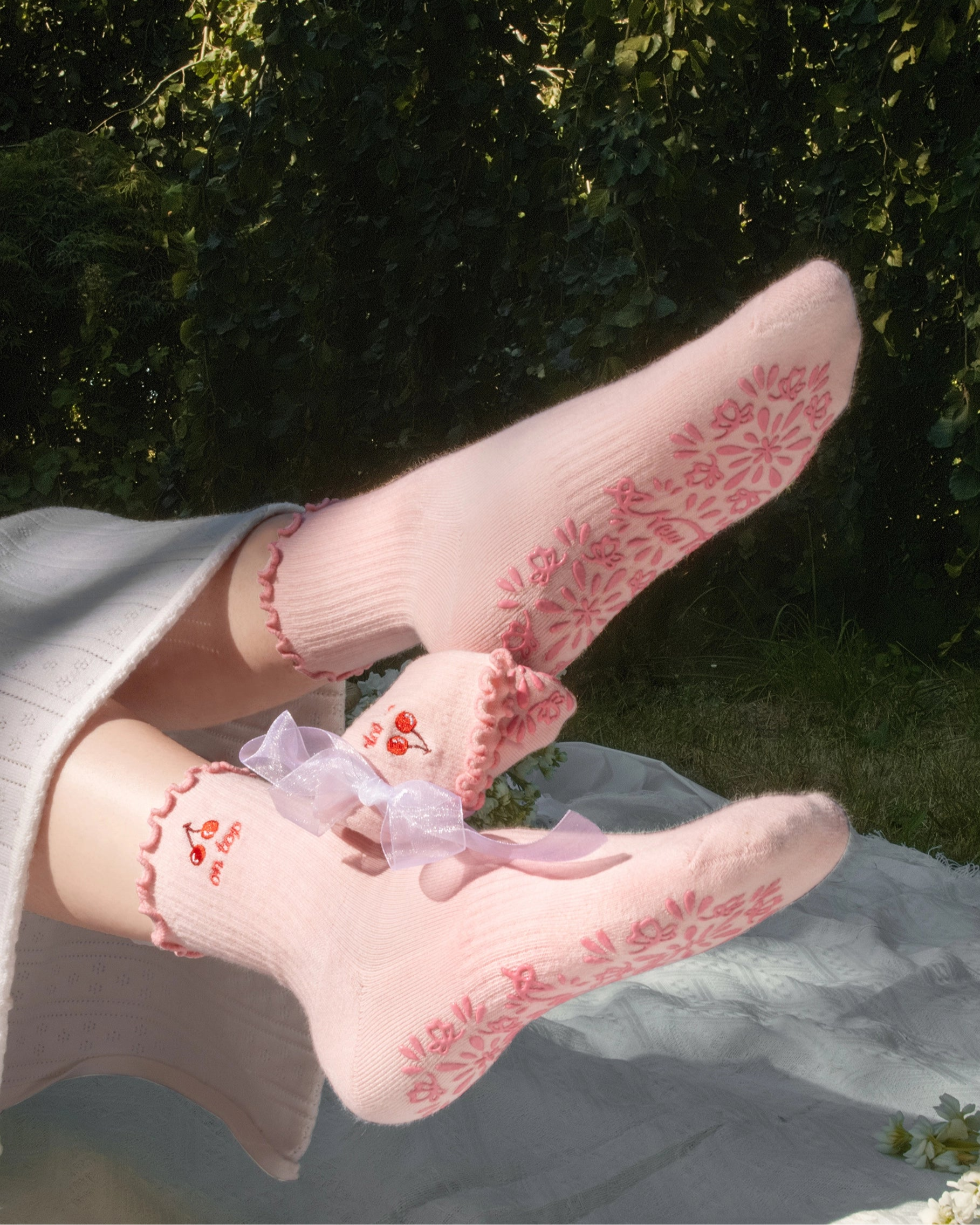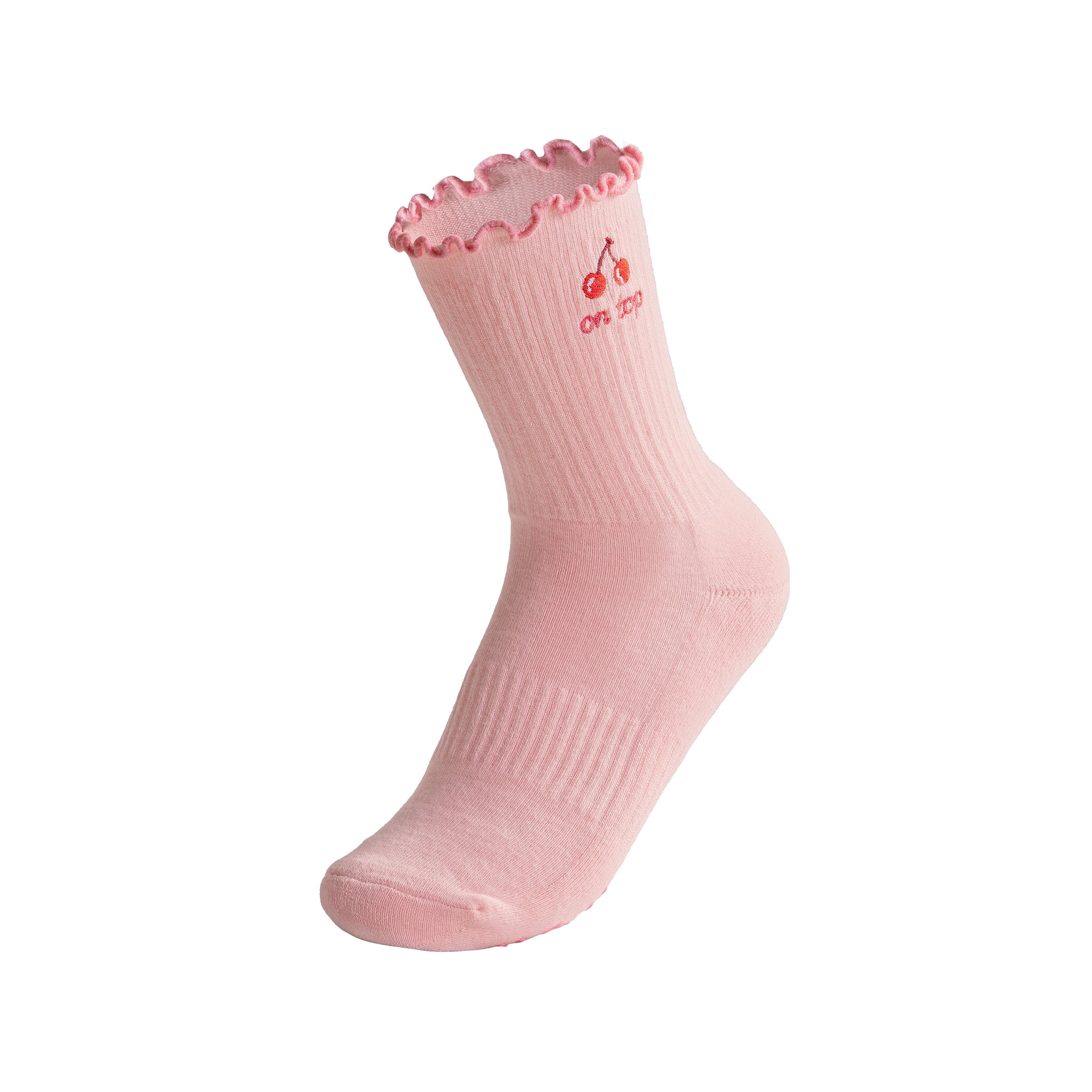 These blush pink grip Pilates socks with cherries and ruffles are made to remind you that you are the sweetest finishing touch.